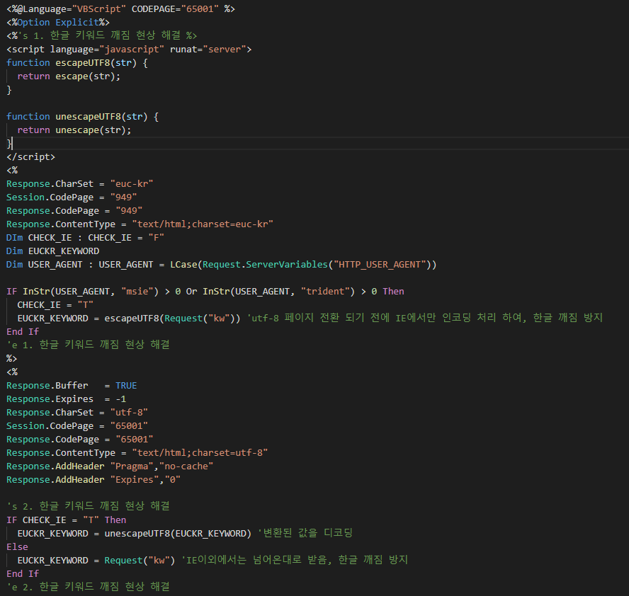 EUCKR_KEYWORD = escapeUTF8(Request("kw")) 'utf-8 ํ์ด์ง ์ ํ ๋๊ธฐ ์ ์ IE์์๋ง ์ธ์ฝ๋ฉ ์ฒ๋ฆฌ ํ์ฌ, ํ๊ธ ๊นจ์ง ๋ฐฉ์ง