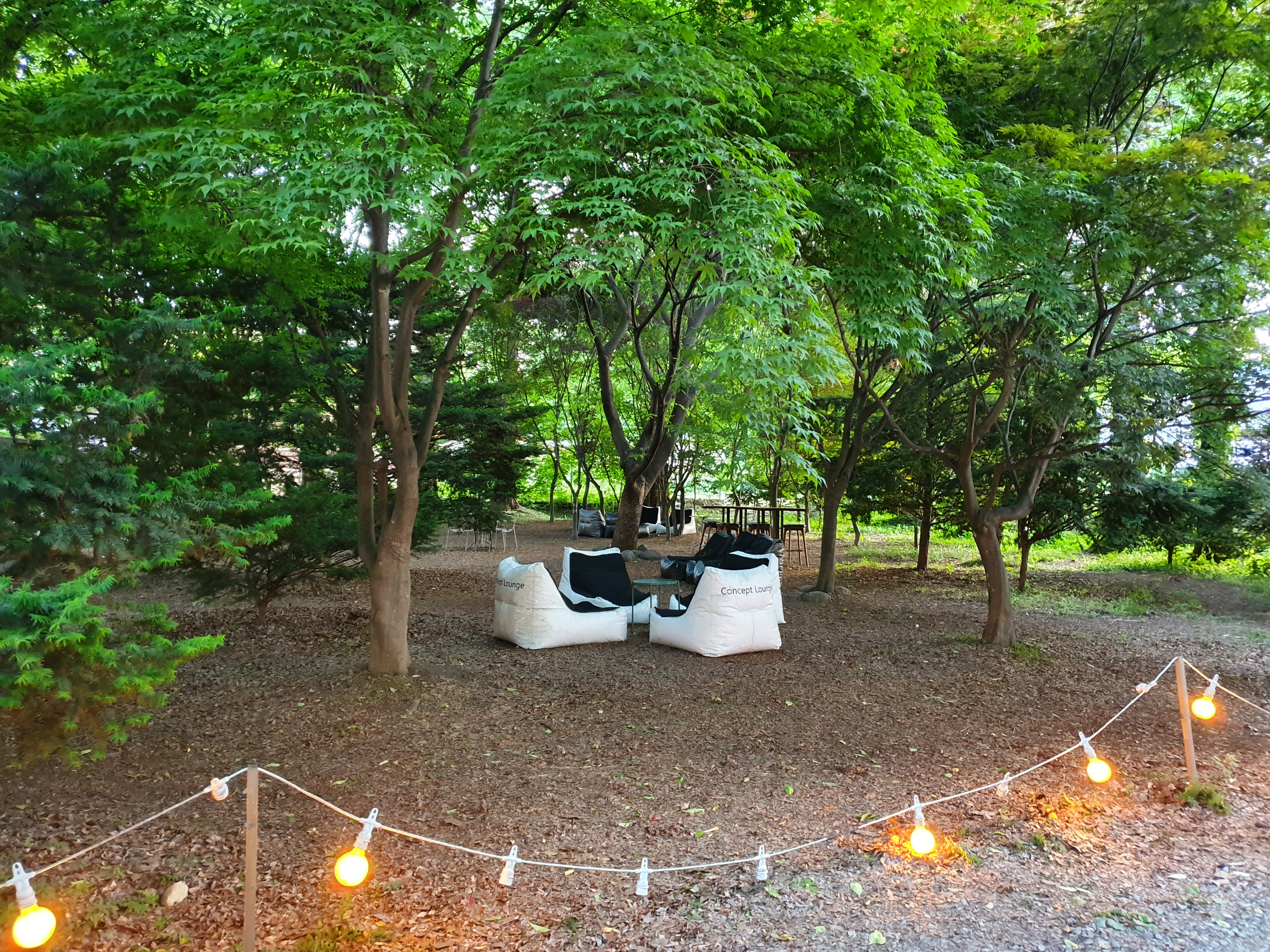 ์•ผ์™ธ์ž๋ฆฌ๋Š” ์ปค๋‹ค๋ž€ ๋‚˜๋ฌด๋“ค์ด ํ–‡๋ณ• ๊ฐ€๋ ค์ฃผ๊ณ