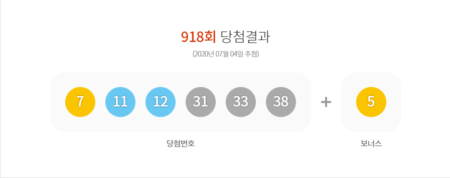 ๋ก๋ 918ํ ๋น์ฒจ๋ฒํธ 7 11 12 31 33 38 ๋ณด๋์ค 5