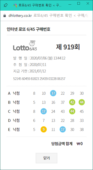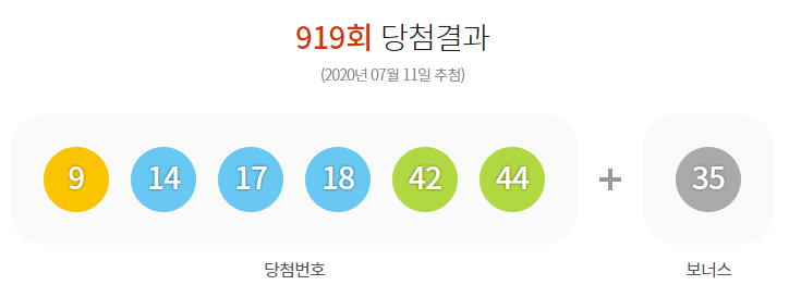 ๋ก๋ 919ํ ๋น์ฒจ๋ฒํธ 9 14 17 18 42 44 ๋ณด๋์ค 35