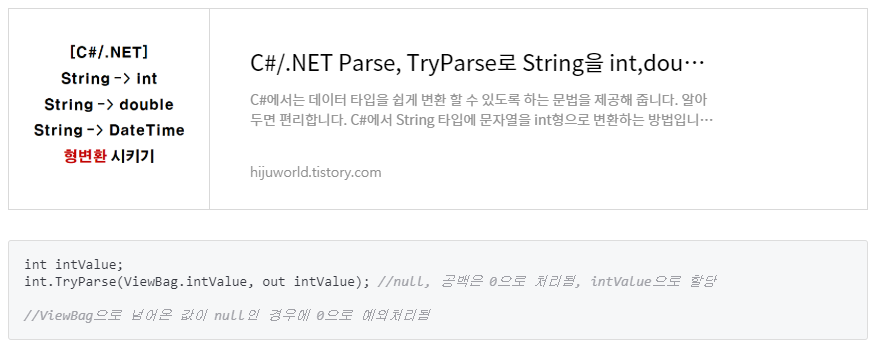 C#/.NET Parse, TryParse๋ก String์ int,double,DateTime ํ์ ์ผ๋ก ํ๋ณํ ์ํค๊ธฐ