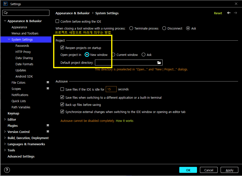 Settings Path > File | Settings | Appearance & Behavior | System Settings