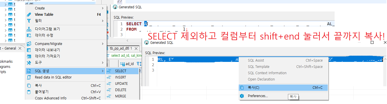 2. SELECT ์ ์ธํ๊ณ ์ปฌ๋ผ์์ญ๋ถํฐ shift + end ๋๋ฌ์ ๋๊น์ง ๋ณต์ฌ